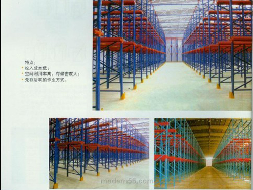 通廊式货架又称贯通式货架、驶入式货架。此系统货架排布密集,空间利用率极高,几乎是托盘式货架的两倍,但货物必须是少品种大批量型,货物先进后出。首先须进行集装单元化工作,确定托盘的规格、载重量及堆高。由此确定单元货架的跨度、深度、层间距,根据屋架下沿的有效高度确定货架的高度。靠墙区域的货架总深度最好控制在6个托盘深度以内,中间区域可两边进出的货架区域总深度最好控制在12个托盘深度以内,以提高叉车存取的效率和可靠性(此类货架系统中,叉车为持续“高举高打”作业方式,叉车易晃动而撞到货架,故稳定性的考虑充分与否至关重要)。此类仓储系统稳定性较弱,货架不宜过高,通常应控制在10m以内,且为了加强整个货架系统的稳定性,除规格、选型要大一些外,还须加设拉固装置。单托货物不宜过大、过重,通常重量控制在1500kg以内,托盘跨度不宜大于1.5m。常配叉车为前移式电瓶叉车或平衡重电瓶叉车。多用于乳品、饮料等食品行业,冷库中也较为多见。
